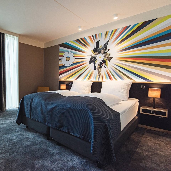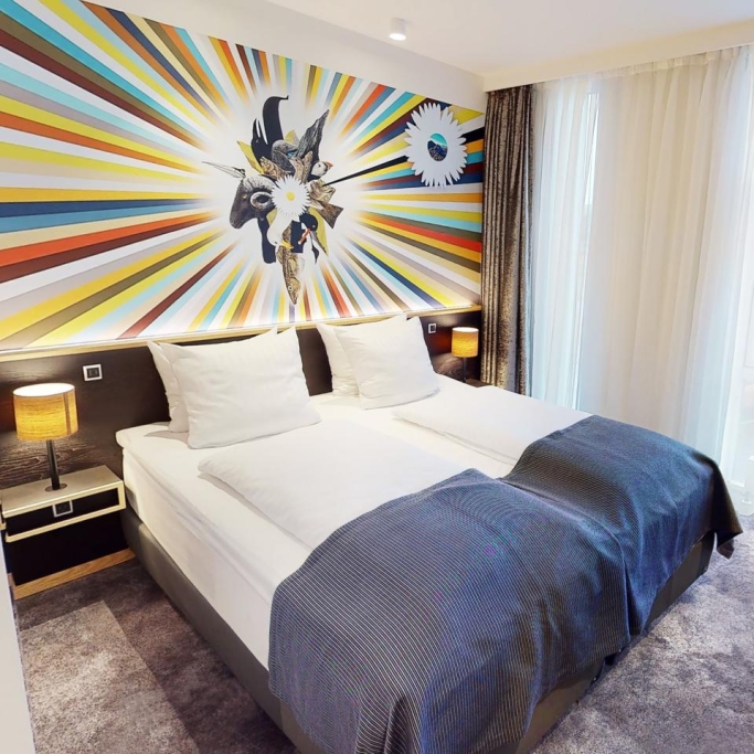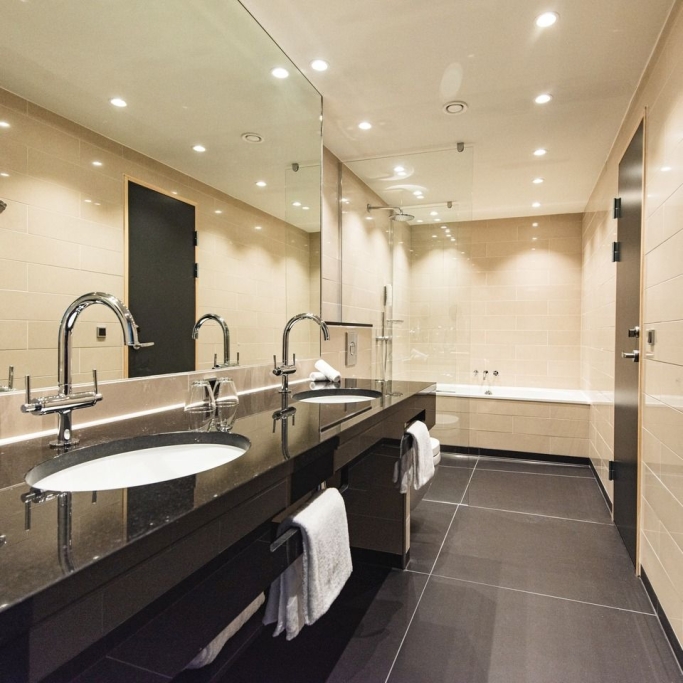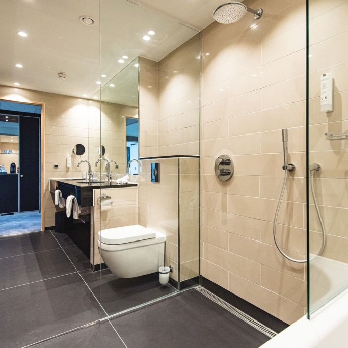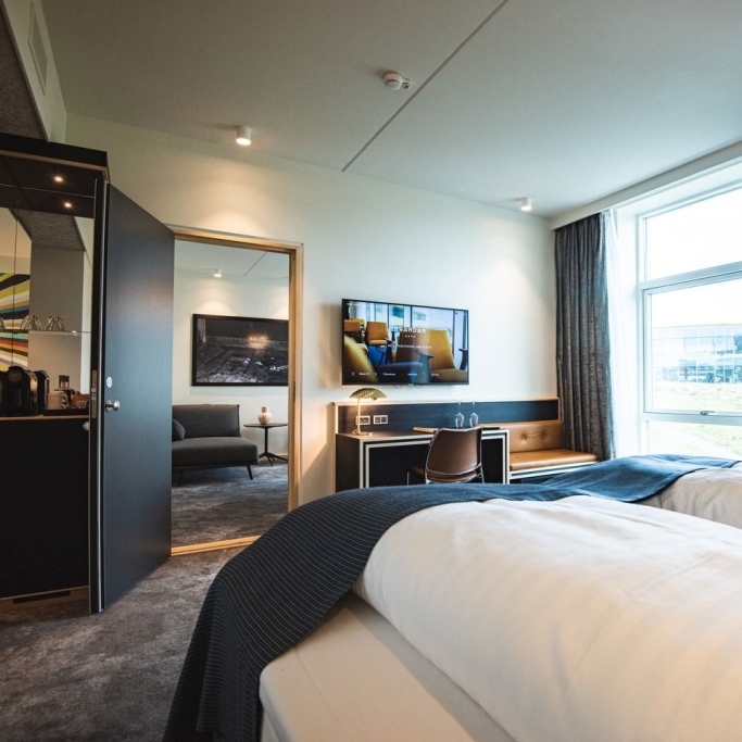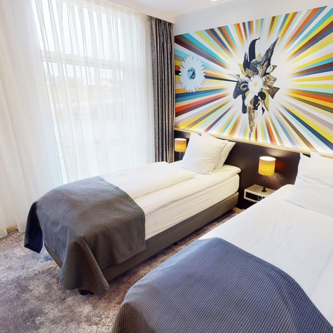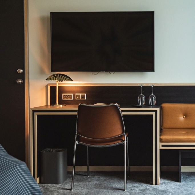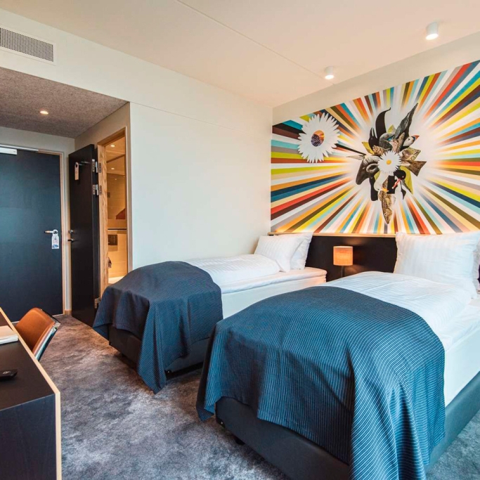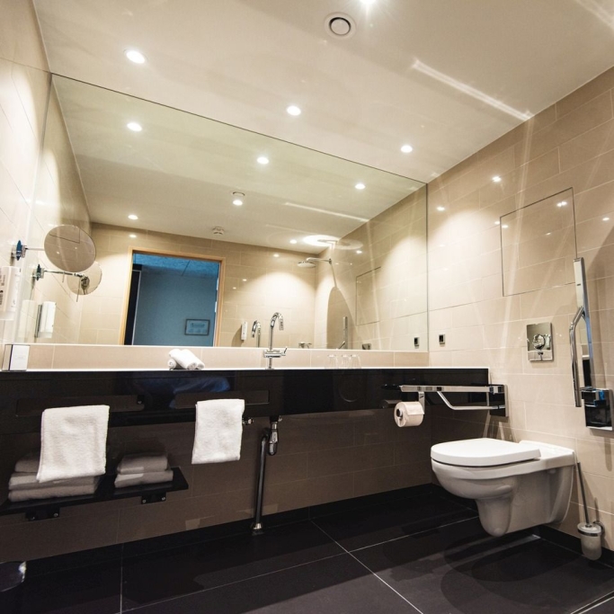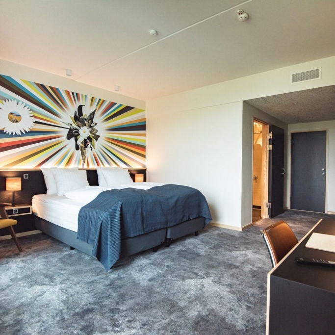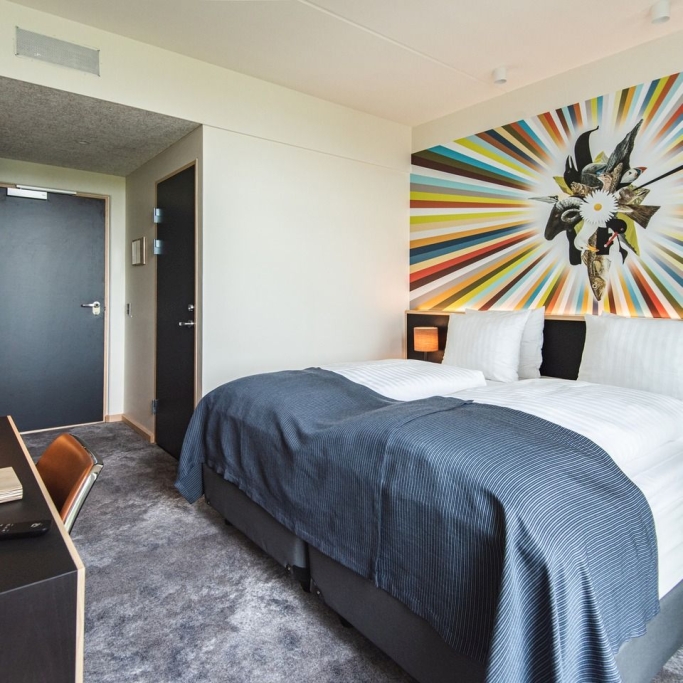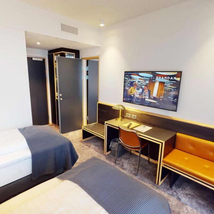 Spacious room with a high quality double bed, coffee urn, flatscreen with cromecast and private bathroom with makeup mirror. The room is designed to accommodate individuals with physical disabilities and allergies. If you are several people staying for the night, we offer the option of booking a room with a connecting door to either a suite or a twin room, as displayed in our 360-degree photos.