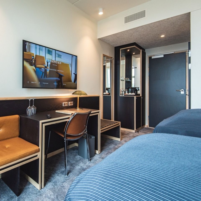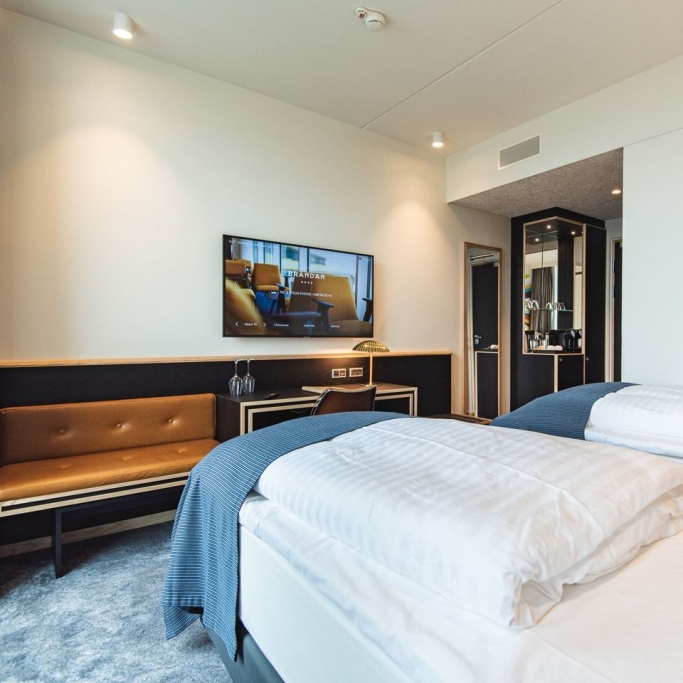 Moderne Zimmer mit zwei Premium Betten, Wasserkocher, Flatscreen TV mit Chromecast und Badezimmer mit Make Up Spiegel und umweltfreundlichem WC. Diese Zimmer sind auch für Allergiker geeignet.